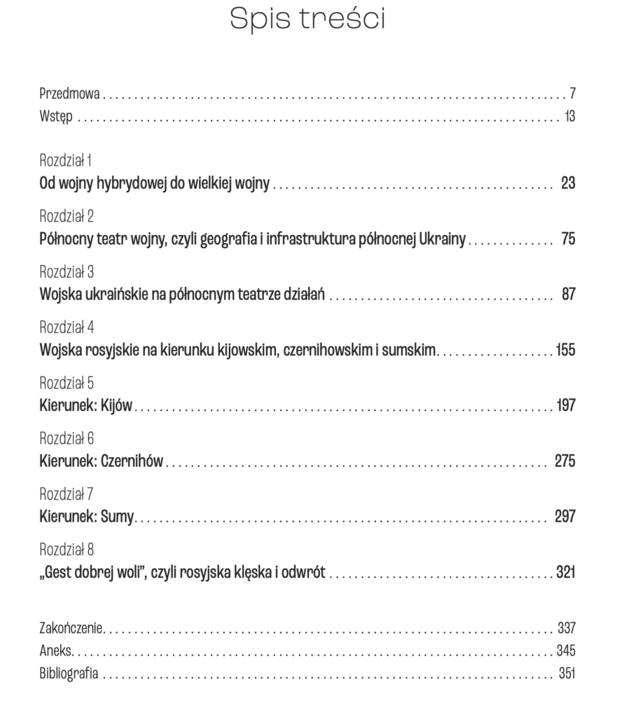 Autor przedstawia kolejno: tło polityczne konfliktu — od Euromajdanu przez aneksję Krymu po walki w Donbasie — a następnie geografię i infrastrukturę północnej Ukrainy, siły obu stron oraz przebieg walk pod Kijowem, Czernihowem i w obwodzie sumskim. Osobny rozdział poświęcony jest rosyjskiemu odwrotowi, zbrodniom wojennym w podkijowskich miejscowościach oraz nieudanym negocjacjom w Stambule.